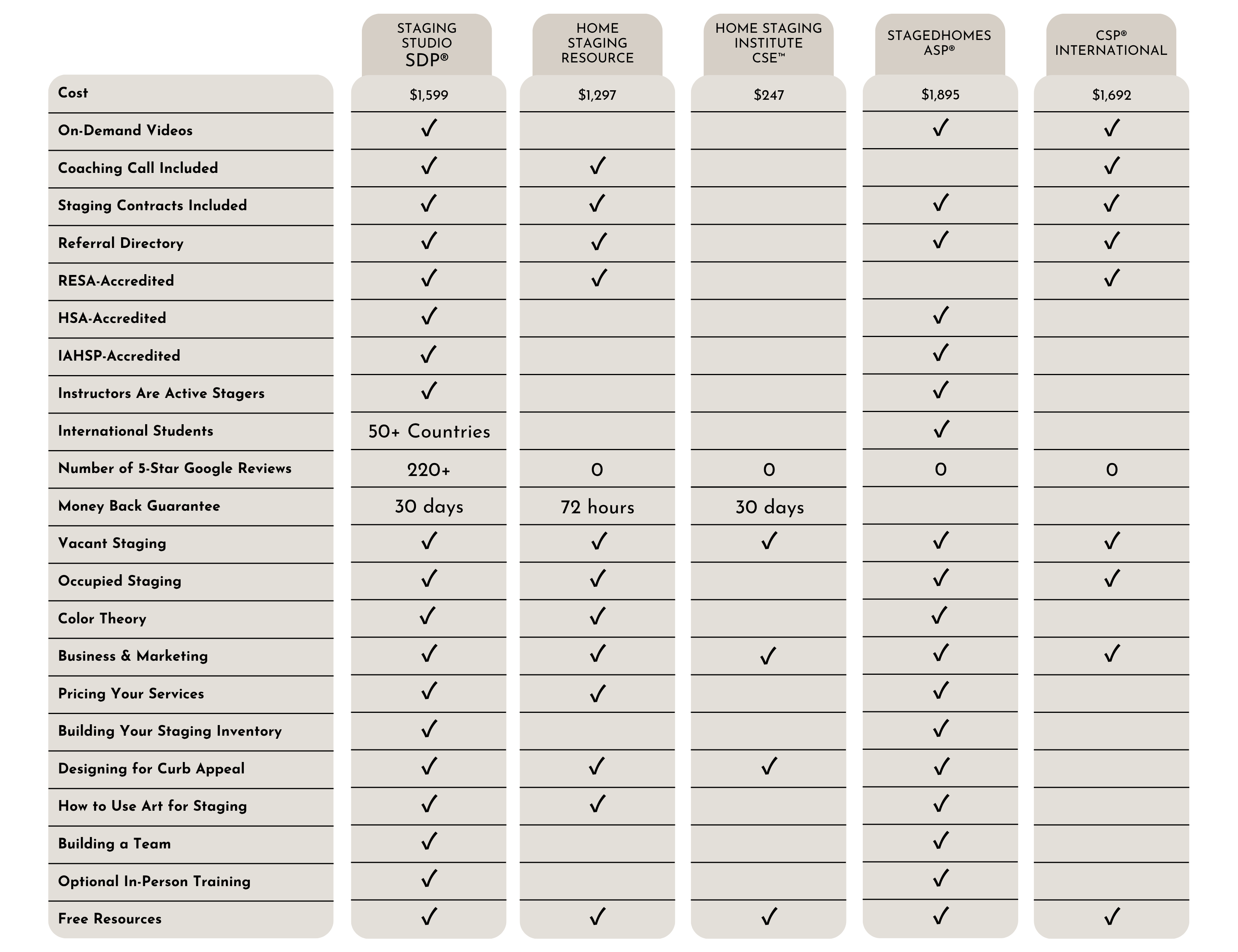 We created the chart below so you can compare some of the most popular programs. These are by no means all of the home staging programs available to you, but they are among the most widely recognized in the industry: